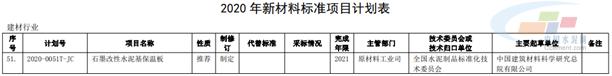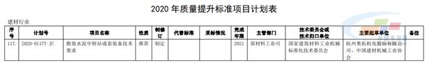 其中,計劃號為2020-0051T-JC的石墨改性水泥基保溫板被列入2020年新材料標(biāo)準(zhǔn)項目計劃表;計劃號為2020-0117T-JC的散裝水泥中轉(zhuǎn)站成套裝備技術(shù)要求被列入2020年質(zhì)量提升標(biāo)準(zhǔn)項目計劃表。