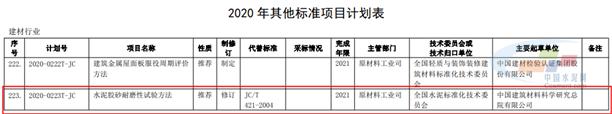 另外,計劃號為2020-0214T-JC的混凝土抗壓強(qiáng)度檢測方法直拔法、計劃號為2020-0218T-JC的水泥工業(yè)用V型靜態(tài)選粉機(jī)、計劃號為2020-0223T-JC的水泥膠砂耐磨性試驗方法均被列入2020年其他標(biāo)準(zhǔn)項目計劃表中。